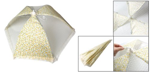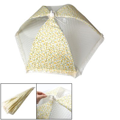 Look like a umbrella, can be folded for easy storage. Flower print, lace trim, mesh and nylon surface, metal frame. Can keep the insects and debris from invading the food, is suitable for cookout, camping, family renuions, picnic, BBQ, etc.