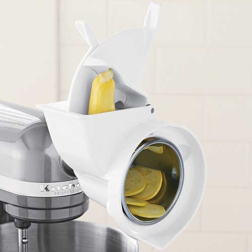 KitchenAid Rotor Slicer/ShredderKitchenAid Slicer/Shredderincludes 4 stainless steel cones to produce thinand thick slicing, and fine and coarse shredding of firm foods. Designed to work with all models ofKitchenAid Stand Mixers. All parts of Slicer/Shredder are Dishwasher Safe. Instruction guide included.