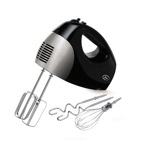 The hand mixer comes in both black (model 2577) and white (model 2534), each with the Oster logo and a chromed or stainless-steel hubcap for timeless good looks.