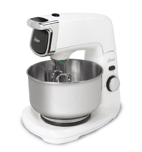 New Oster Stand Mixer in white with chrome accents. Made of durable die-cast, all metal construction; providing 350 watts of mixing power. Also includes a 4.6 quart stainless steel bowl and a large speed control knob for easy adjustment (12 variable speeds!). In addition, a whole set of attachments for all types of mixing needs is included (beaters, dough hooks).