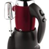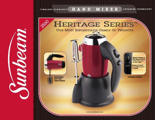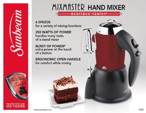 The Sunbeam Heritage Series hand mixer comes in a variety of colors, including red (model 2560), black (model 2561), white (model 2562), and Silver (model 3156), each with sleek black accents, a Heritage Series badge, and a chromed hubcap complete with the Sunbeam logo.